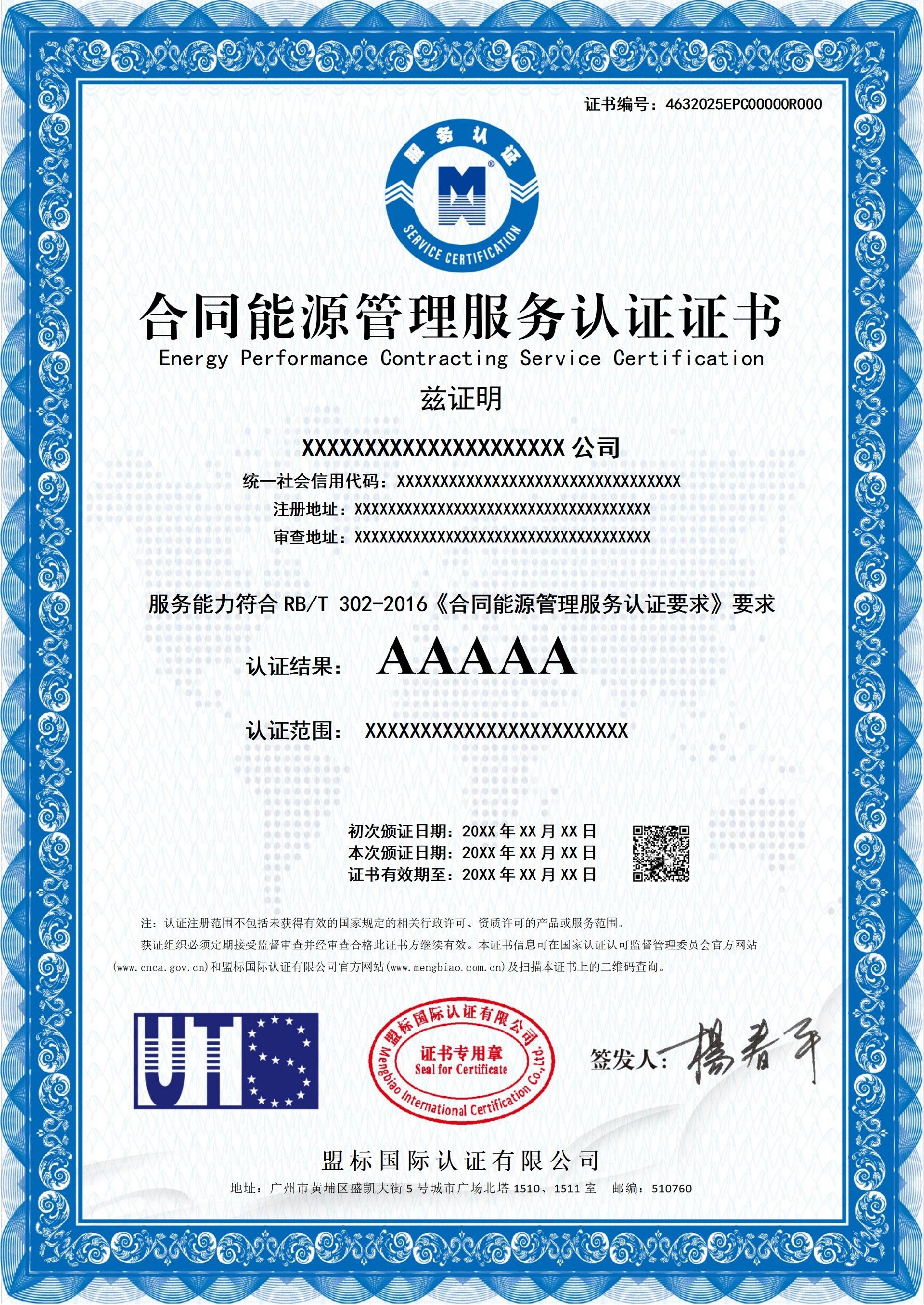 合同能源管理服務(wù)認(rèn)證證書(shū)-樣版