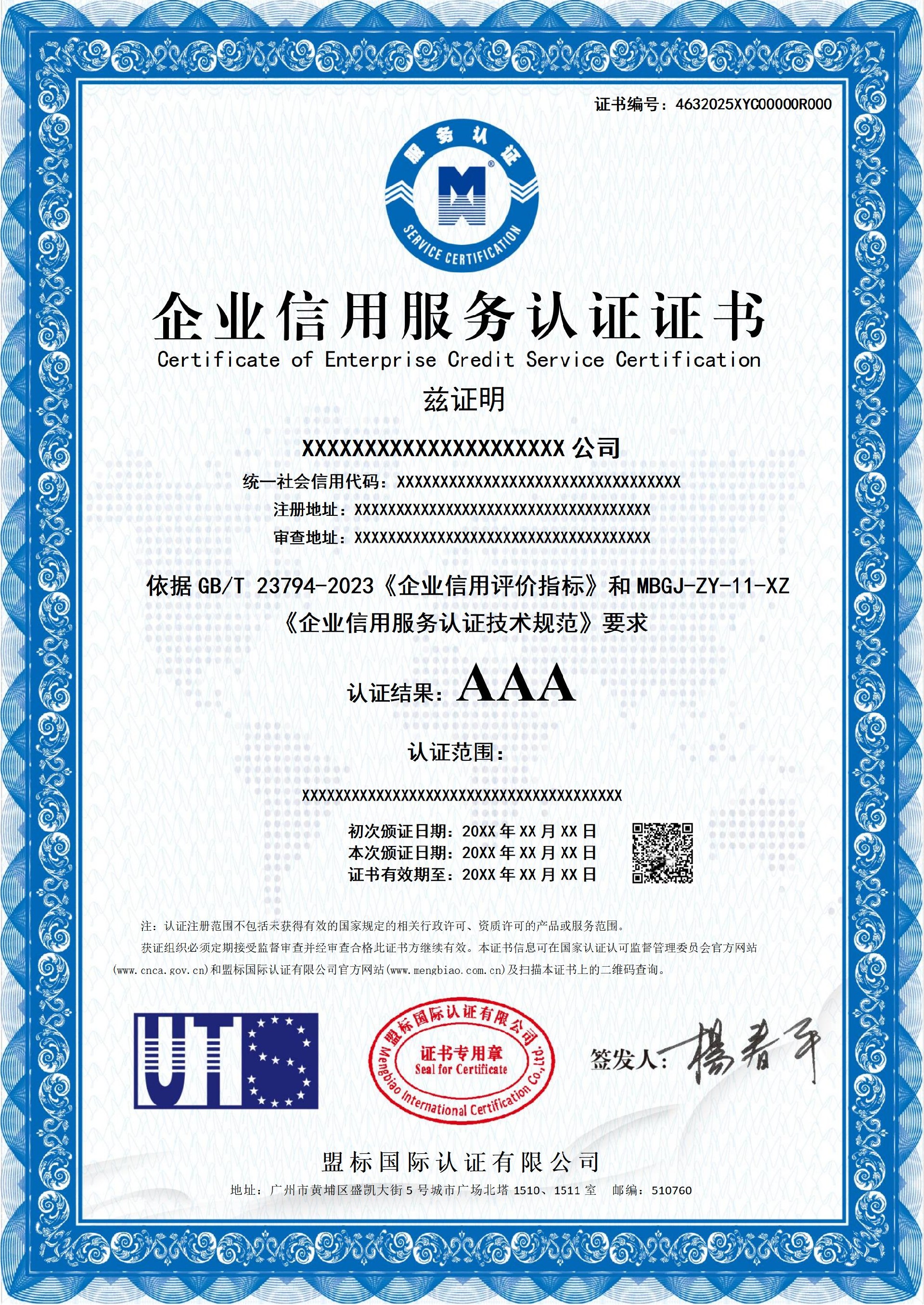企業(yè)信用服務(wù)認(rèn)證證書(shū)-樣版