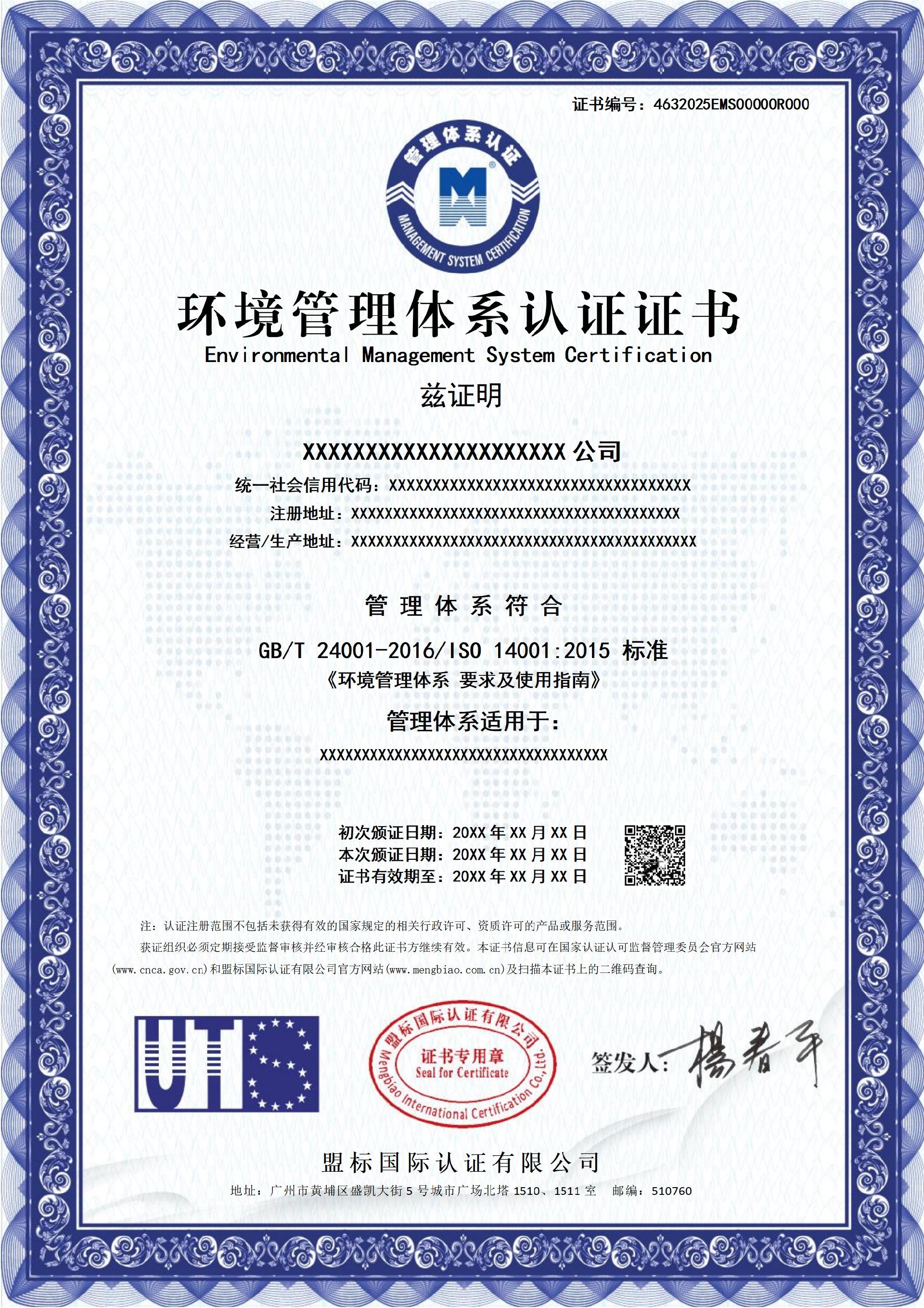 環(huán)境管理體系認(rèn)證證書-樣版